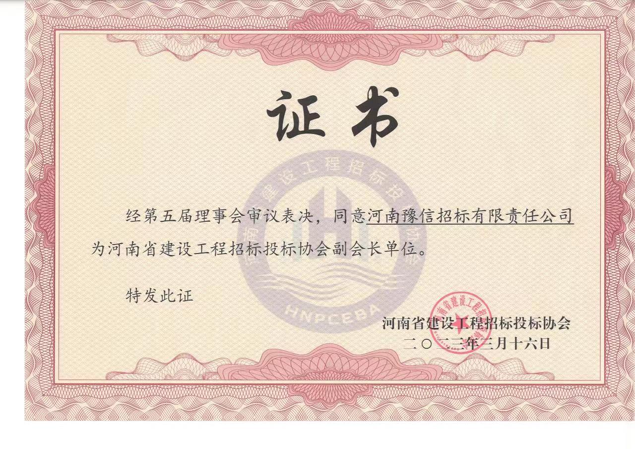 經(jīng)第五屆理事會(huì)審議表決,同意河南豫信招標(biāo)有限責(zé)任公司為河南省建設(shè)工程招標(biāo)投標(biāo)協(xié)會(huì)副會(huì)長單位。 -