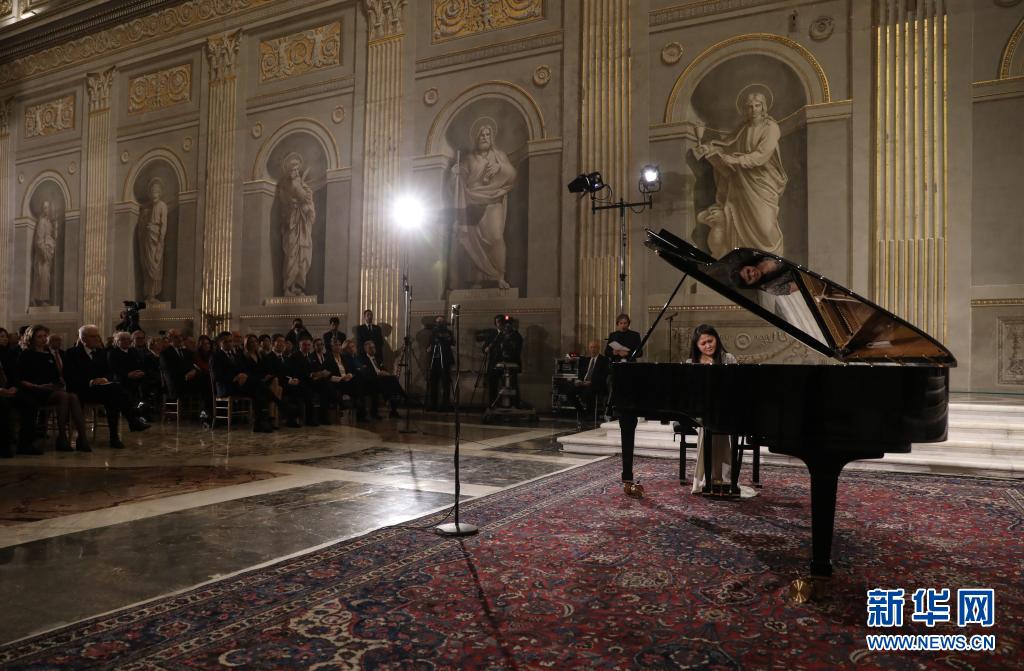 2020年2月13日,在意大利羅馬總統(tǒng)府奎里納萊宮,旅意華人鋼琴家居覲在音樂會現(xiàn)場演奏。當(dāng)日,由意大利總統(tǒng)馬塔雷拉提議,在2020年中意文化旅游年計劃外加演的一場鋼琴獨奏音樂會在意大利總統(tǒng)府舉行,向抗擊新冠肺炎疫情的中國人民傳達(dá)友誼和支持。新華社記者 程婷婷 攝