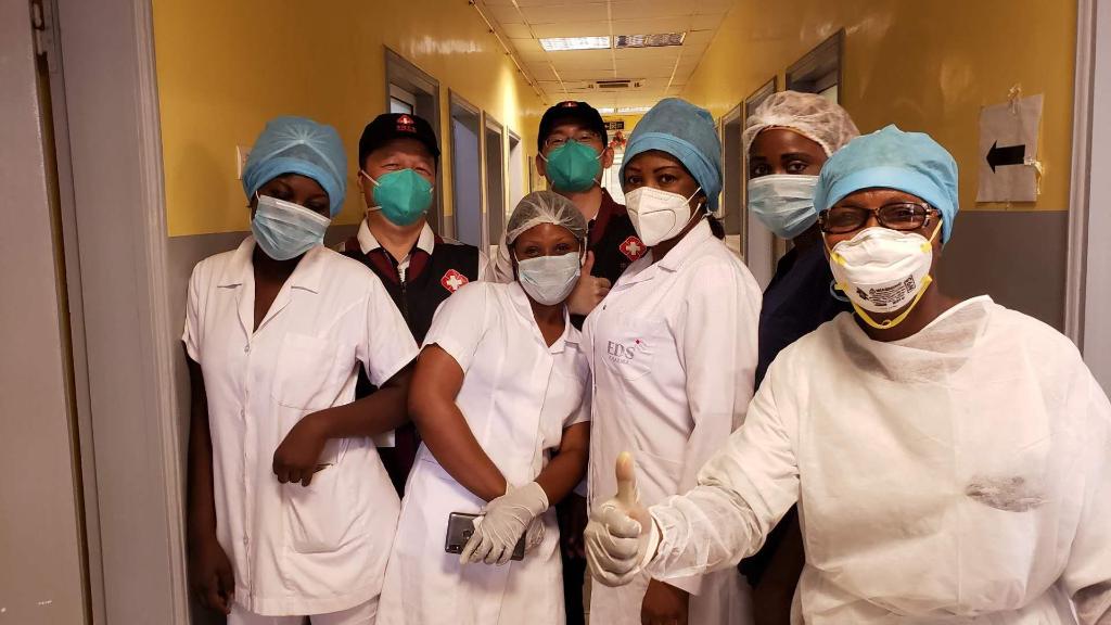 2020年5月26日,中國抗疫醫(yī)療專家組在剛果(布)首都布拉柴維爾指導新冠肺炎病房建設時,與當?shù)匾痪€醫(yī)務人員合影。