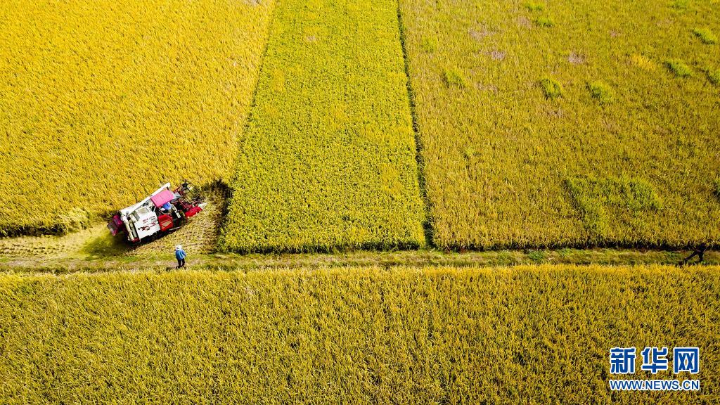 2020 年 10 月 21 日,在山東省棗莊市臺兒莊區(qū)邳莊鎮(zhèn),收割機(jī)在收獲水稻(無人機(jī)照片)。 新華社記者 郭緒雷 攝