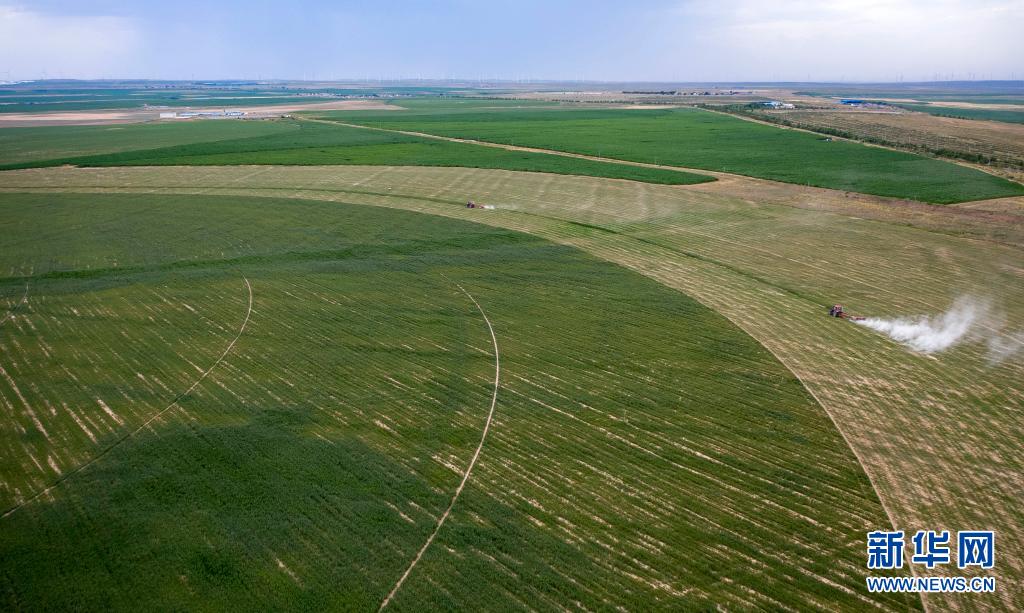 在寧夏鹽池縣馮記溝鄉(xiāng)平臺(tái)村的優(yōu)質(zhì)牧草基地,農(nóng)戶用機(jī)械收割牧草(無人機(jī)照片,7月14日攝)。新華社記者 楊植森 攝