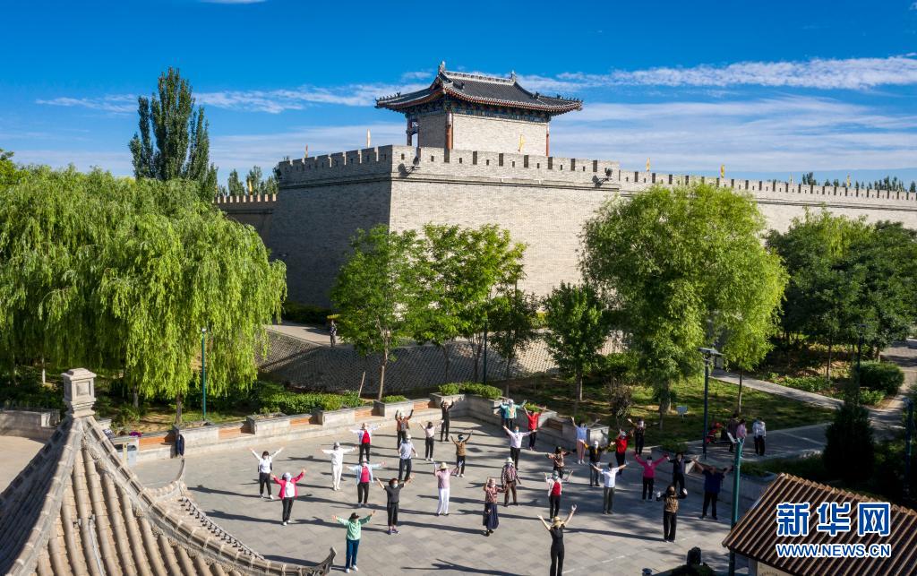 6月18日,寧夏鹽池縣居民在城墻腳下跳廣場(chǎng)舞(無人機(jī)照片)。新華社記者 馮開華 攝