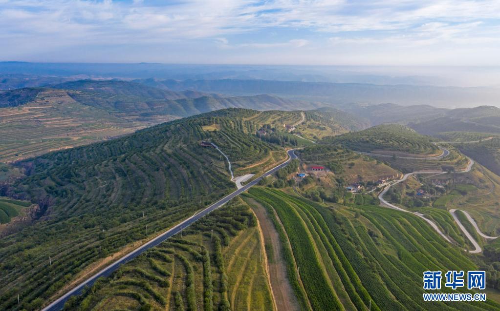 這是7月13日在寧夏固原市彭陽(yáng)縣拍攝的青云灣旱作梯田公園(無人機(jī)照片)。新華社記者 馮開華 攝