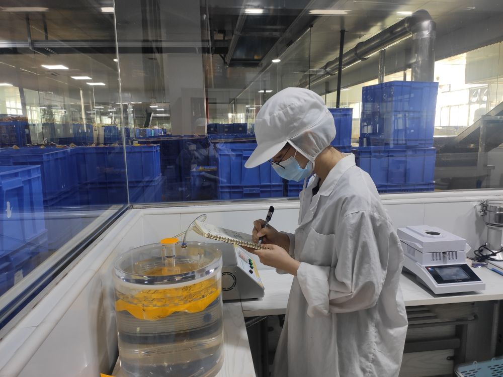 2021年7月19日,韋雪在螺螄粉生產(chǎn)車間巡檢。(受訪者供圖)