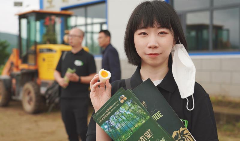 2020年8月,阿里鄉(xiāng)村品牌設(shè)計師蔣宇寧在吉林省汪清縣走訪調(diào)研松針雞養(yǎng)殖基地,手中拿著當(dāng)?shù)氐乃舍橂u蛋。(受訪者供圖)