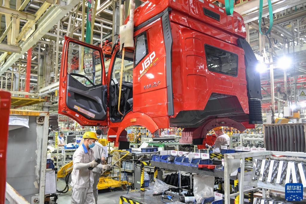 工人在位于長(zhǎng)春的一汽解放總裝車(chē)間裝配車(chē)輛(7月7日攝)。新華社記者 張楠 攝