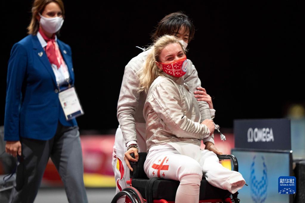 8月25日,在東京殘奧會輪椅擊劍女子佩劍個人賽A級決賽后,中國選手邊靜(中)推著格魯吉亞選手妮諾(右)離開比賽場地。新華社記者 熊琦 攝