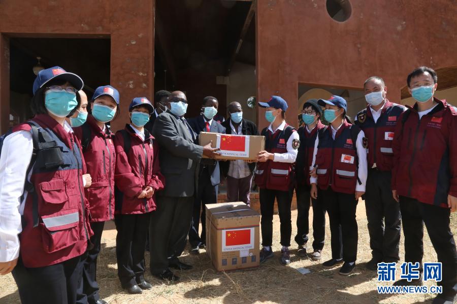 5 月 19 日,在津巴布韋中馬紹納蘭省的姆武爾維醫(yī)院,中國(guó)抗疫醫(yī)療專(zhuān)家組為當(dāng)?shù)蒯t(yī)療機(jī)構(gòu)捐贈(zèng)醫(yī)療物資。新華社記者 張玉亮 攝