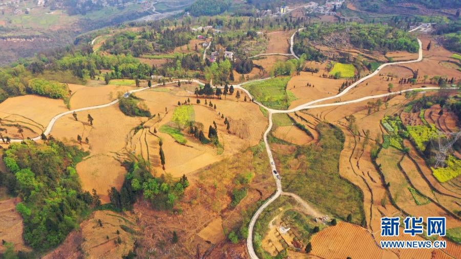 貴州省六枝特區(qū)大箐村的產(chǎn)業(yè)路四通八達(dá),這里是倪裔豹駐村的“最后一崗”(2020年3月24日攝,無人機(jī)照片)。新華社記者 劉勤兵 攝