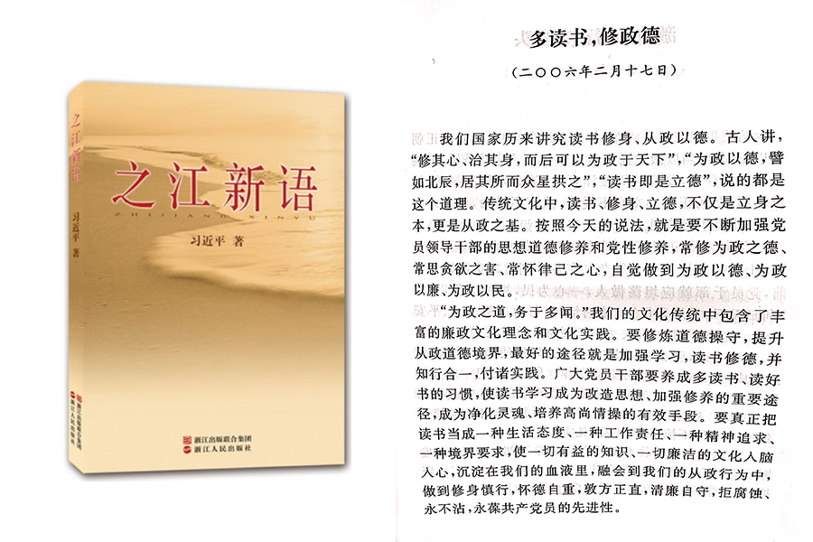 2006年2月17日,時(shí)任浙江省委書記的習(xí)近平用筆名“哲欣”在《浙江日報(bào)》“之江新語”專欄發(fā)表題為《多讀書,修政德》的文章。他說,我們國家歷來講究讀書修身、從政以德。廣大黨員干部要養(yǎng)成多讀書、讀好書的習(xí)慣,使讀書學(xué)習(xí)成為改造思想、加強(qiáng)修養(yǎng)的重要途徑,成為凈化靈魂、培養(yǎng)高尚情操的有效手段。