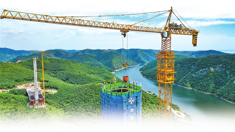 ??8月28日,中交二航局澠淅高速淅川至豫鄂省界段項目丹江小三峽特大橋主塔實現(xiàn)封頂。 本報記者 聶冬晗 攝