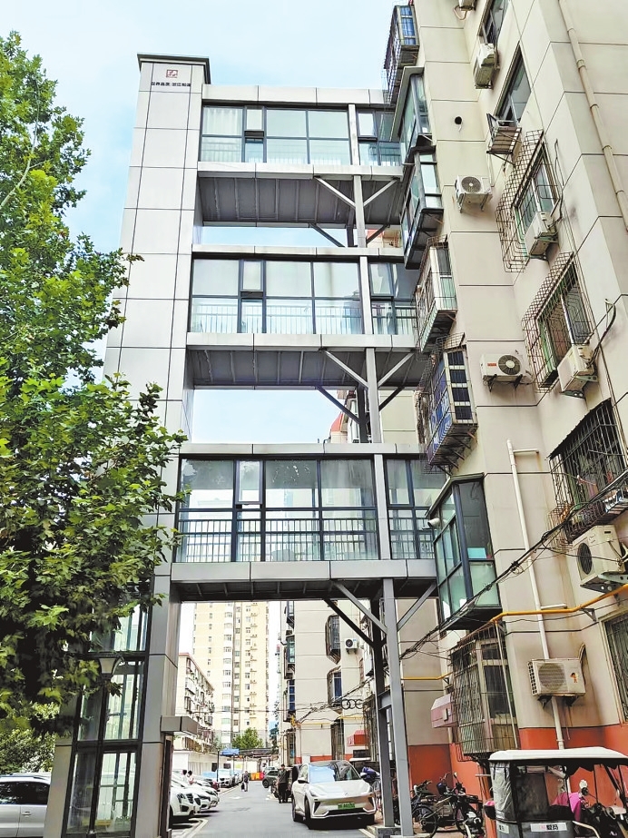 位于鄭州市紫荊山路與順河路交叉口附近的順河路43號(hào)院內(nèi),老舊樓加裝的跨路連廊電梯。 本報(bào)記者 韓春光 攝