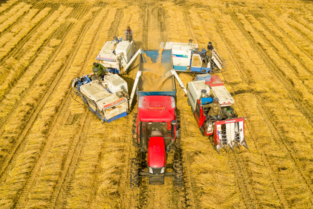 ??在黑龍江省綏化市北林區(qū)雙河鎮(zhèn),村民駕駛收割機(jī)進(jìn)行卸糧作業(yè)(2024年10月13日攝,無(wú)人機(jī)照片)。新華社記者 張濤 攝