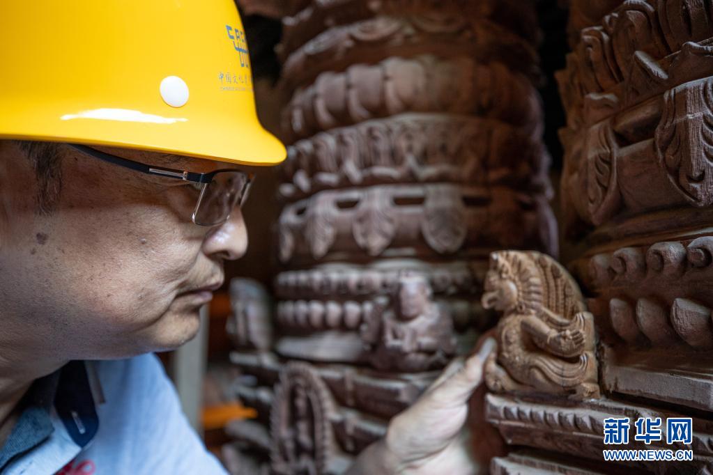 2019年10月10日,在尼泊爾加德滿都杜巴廣場,中國派出的文物修復(fù)隊技術(shù)主管周建國在九層神廟修復(fù)現(xiàn)場查看一個修復(fù)好的文物。新華社記者 王婧嬙 攝