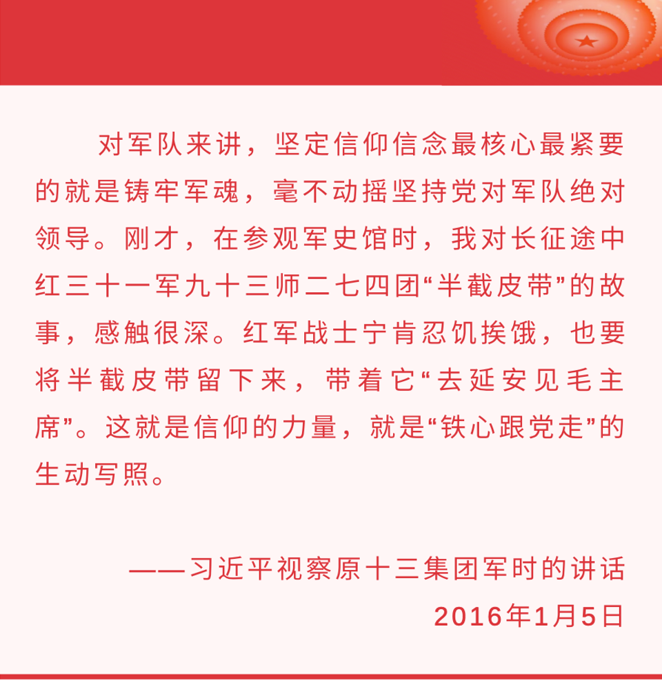 2016年1月5日,習(xí)主席視察原13集團(tuán)軍,當(dāng)聽到“半截皮帶”的故事時,習(xí)主席深有感觸地說:“這就是信仰的力量,就是‘鐵心跟黨走’的生動寫照。”
