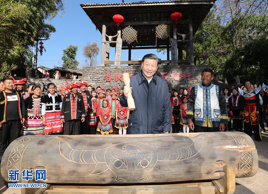 2020年1月19日至21日,中共中央總書記、國(guó)家主席、中央軍委主席習(xí)近平來(lái)到云南,看望慰問(wèn)各族干部群眾,向全國(guó)人民致以新春祝福。這是19日下午,習(xí)近平在騰沖市清水鄉(xiāng)三家村中寨司莫拉佤族村廣場(chǎng)上,敲響三聲佤族木鼓,祝福來(lái)年風(fēng)調(diào)雨順、國(guó)泰民安。 新華社記者 鞠鵬 攝