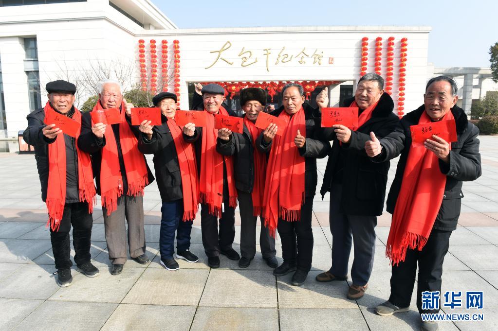 2月3日,在安徽省滁州市鳳陽縣小崗村,8位“大包干”帶頭人在大包干紀(jì)念館前展示自家領(lǐng)取的集體經(jīng)濟(jì)收益股權(quán)分紅。新華社記者 周牧 攝