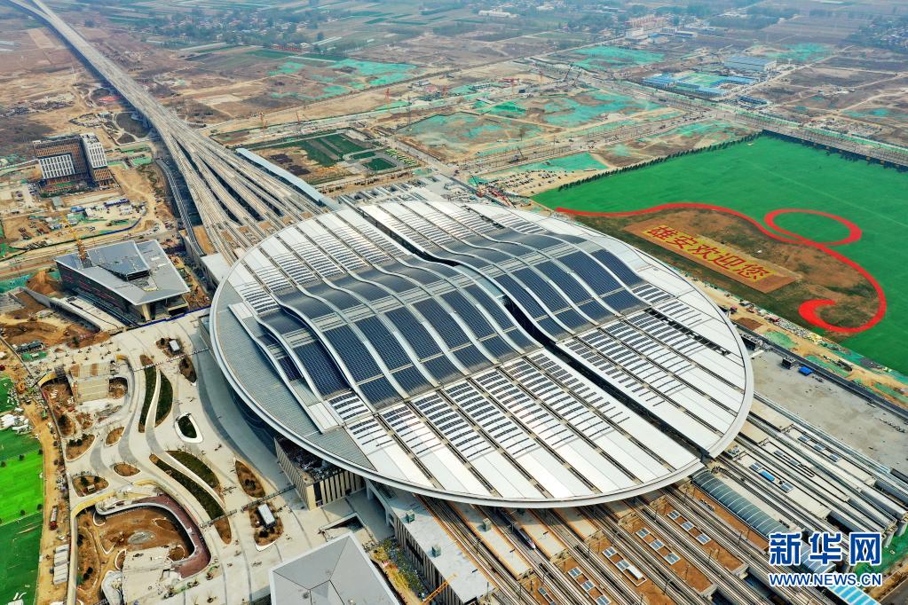 這是4月9日拍攝的京雄城際鐵路雄安站(無人機(jī)照片)。新華社記者 牟宇 攝
