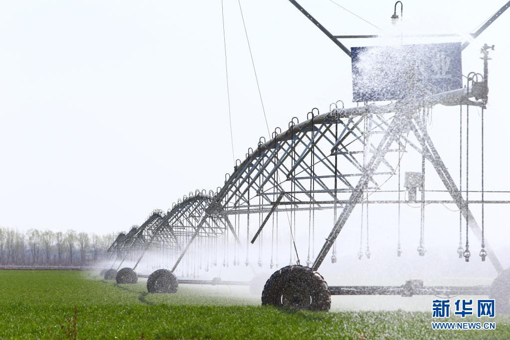 2021 年 2 月 23 日,在河南省鶴壁市浚縣一片高標(biāo)準(zhǔn)農(nóng)田里,自走式噴灌機(jī)在為小麥澆水。 新華社記者 許雅楠 攝