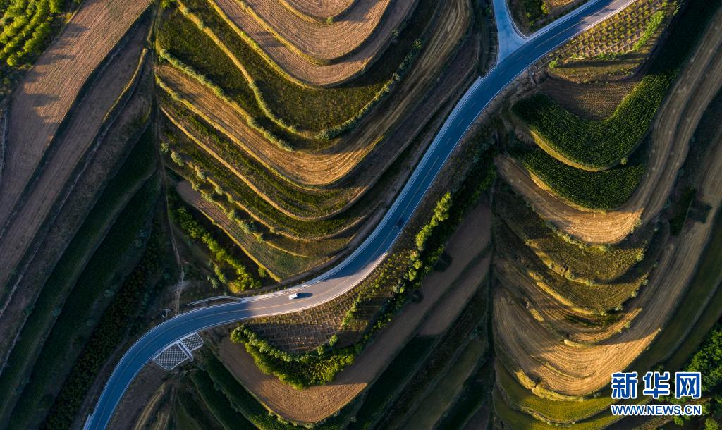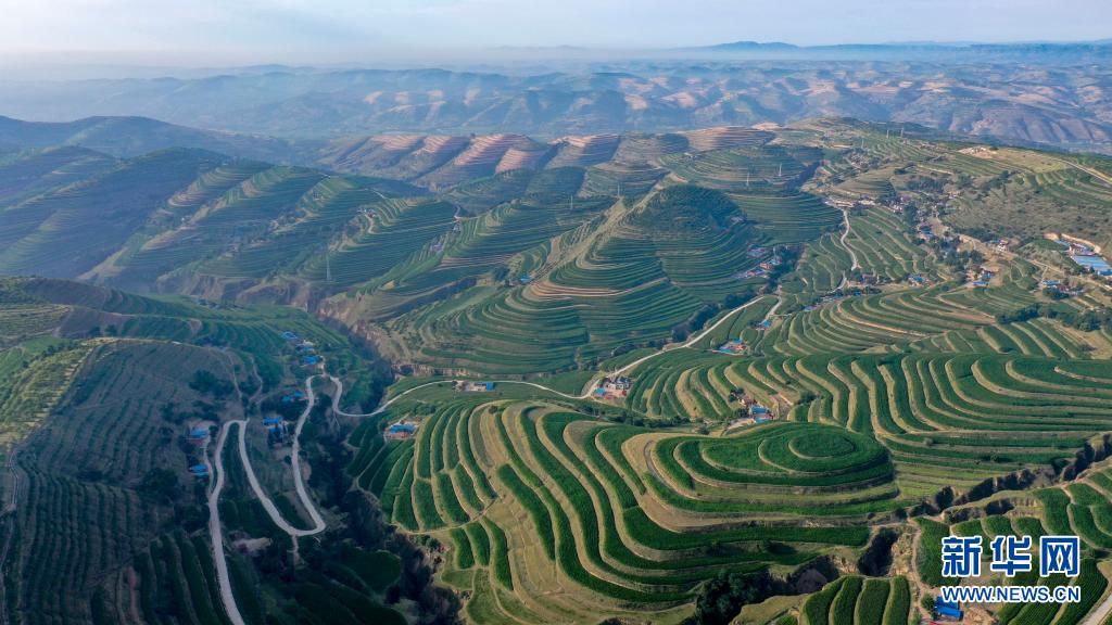 這是7月13日在寧夏固原市彭陽(yáng)縣拍攝的青云灣旱作梯田公園(無人機(jī)照片)。新華社記者 馮開華 攝