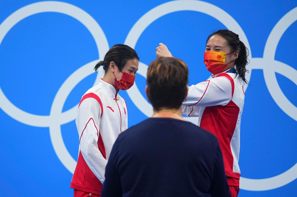 7月25日,中國選手王涵(右)在頒獎儀式上為隊友施廷懋戴金牌。新華社記者 許暢 攝