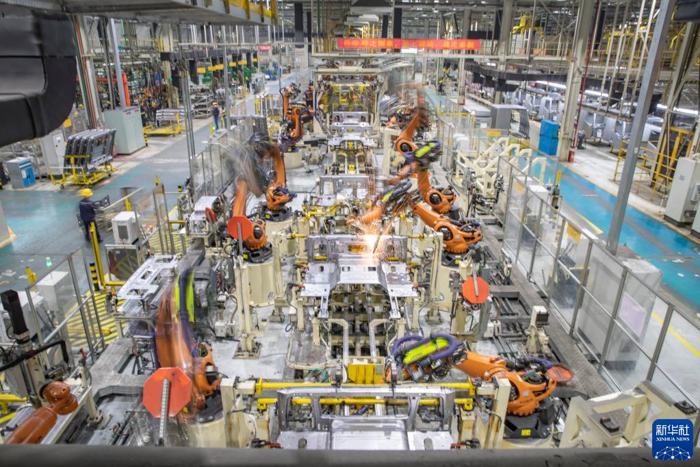 4月2日,在重慶上汽依維柯紅巖商用車(chē)有限公司焊裝車(chē)間,機(jī)器人在進(jìn)行焊接作業(yè)。新華社記者 黃偉 攝