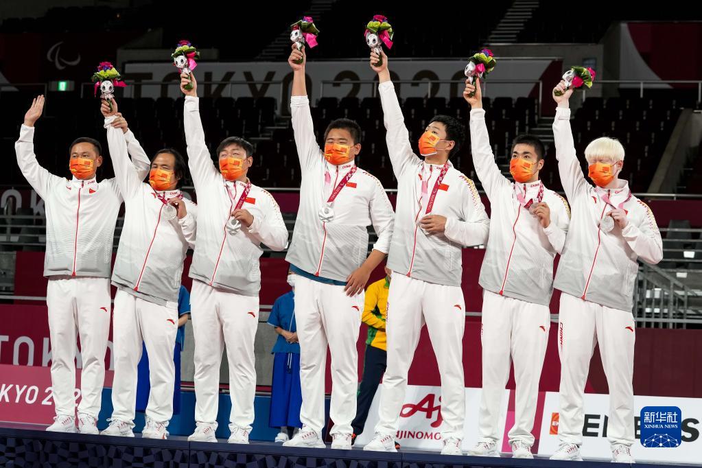 9月3日,摘得銀牌的中國隊在東京殘奧會男子盲人門球頒獎儀式上。新華社記者 張鋮 攝