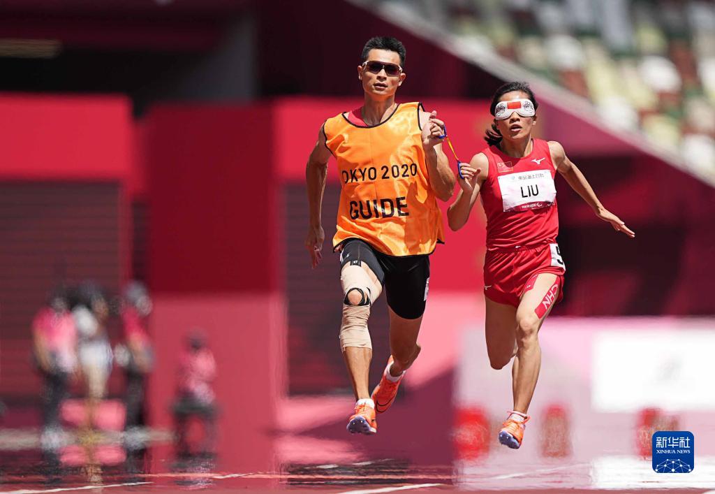 8月30日,中國選手劉翠青(右)和領(lǐng)跑員徐冬林在東京殘奧會田徑女子100米T11級第一輪預(yù)賽中。新華社記者 熊琦 攝