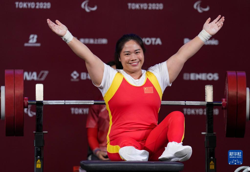 8月28日,中國選手譚玉嬌在東京殘奧會舉重女子67公斤級決賽中慶祝。新華社記者 胡虎虎 攝