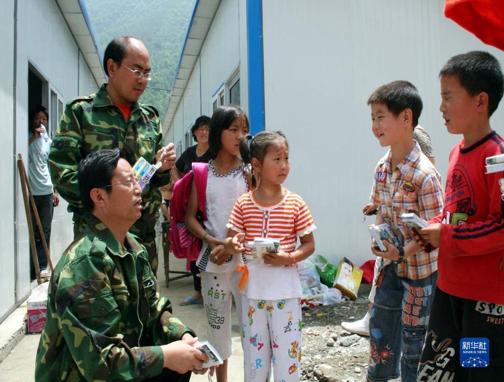 2008年“六一”兒童節(jié)當天,援川干部崔學選(前左)在北川縣桂溪鄉(xiāng)看望受災(zāi)兒童。新華社發(fā)