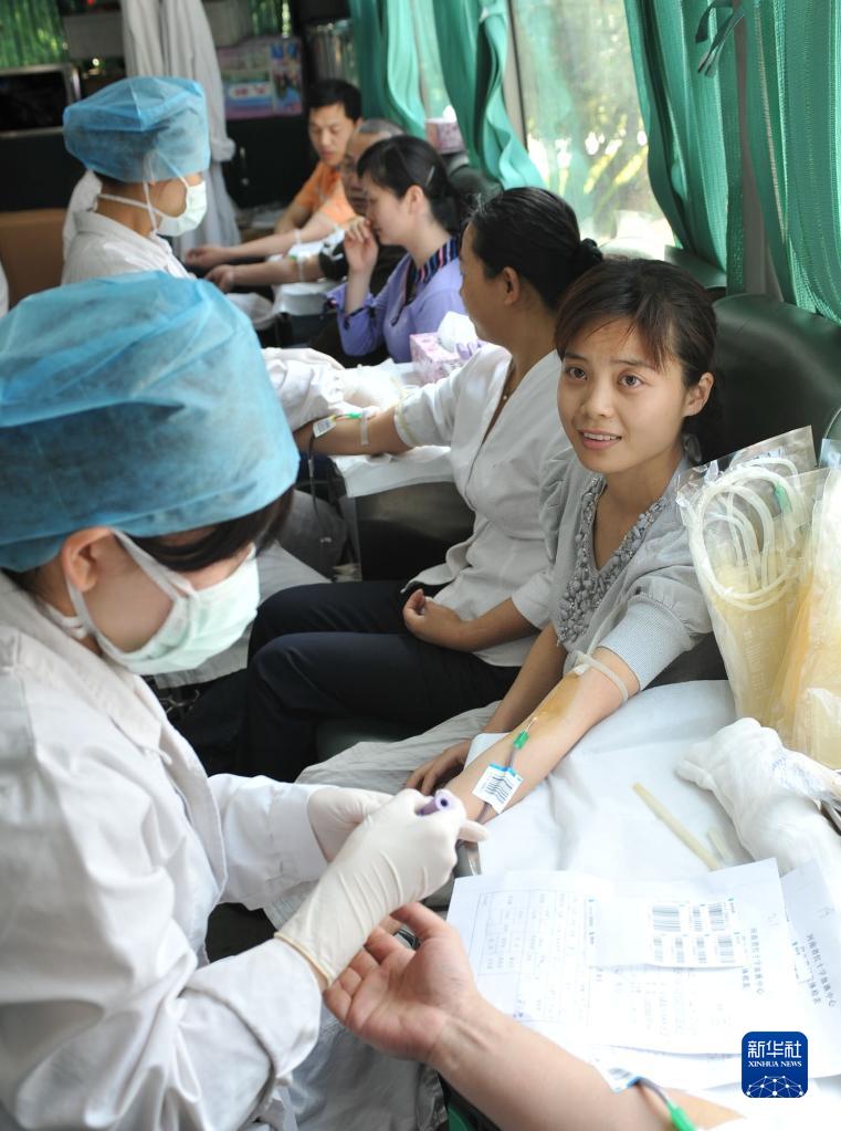 鄭州市委干部肖靜在流動獻血車上獻血(2008年5月14日攝)。2008年5月14日,數(shù)百名鄭州市直機關(guān)干部職工參加援助活動,并為汶川地震災(zāi)區(qū)的受災(zāi)群眾獻血。新華社記者 趙鵬 攝