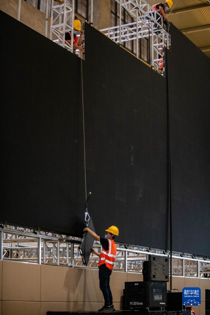 在昆明滇池國際會展中心,工作人員正在搭建會場和新聞中心。施工人員均已接種兩劑新冠肺炎疫苗,每天進(jìn)場還要測體溫、戴口罩。會場相關(guān)設(shè)備將使用可重復(fù)利用的材料,會場不進(jìn)行油漆粉刷、噴涂,也不鋪設(shè)地毯。