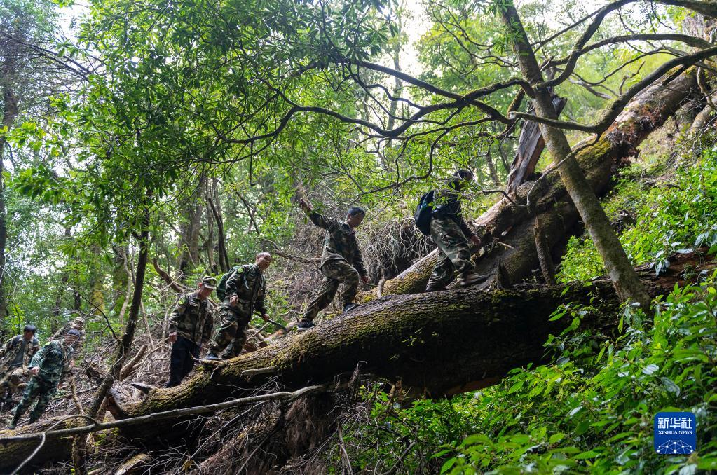 高黎貢山國家級自然保護(hù)區(qū)瀘水專職巡護(hù)隊在山間巡護(hù)(3月12日攝)。新華社記者 陳欣波 攝