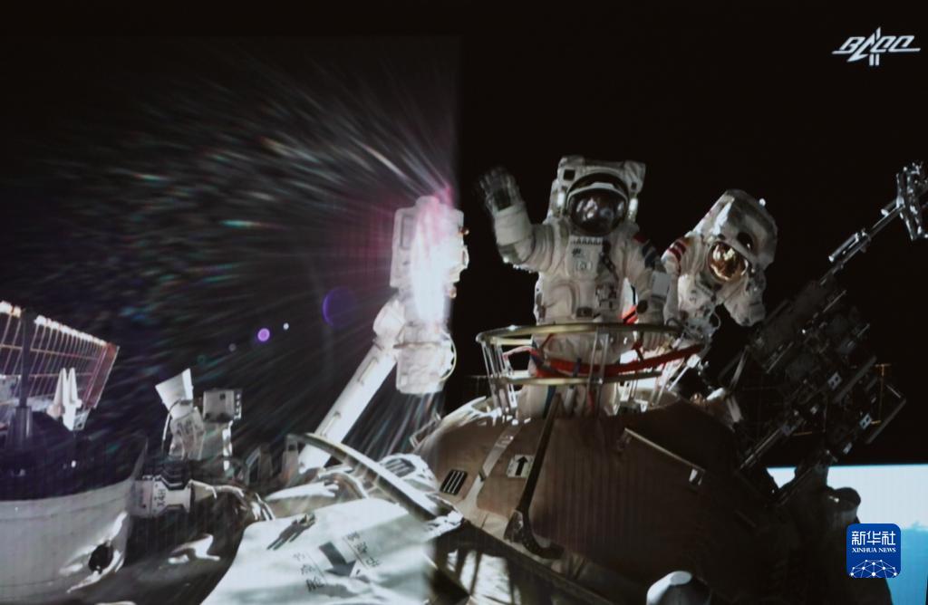 8月20日在北京航天飛行控制中心大屏拍攝的神舟十二號乘組航天員在艙外工作場景。新華社記者 田定宇 攝