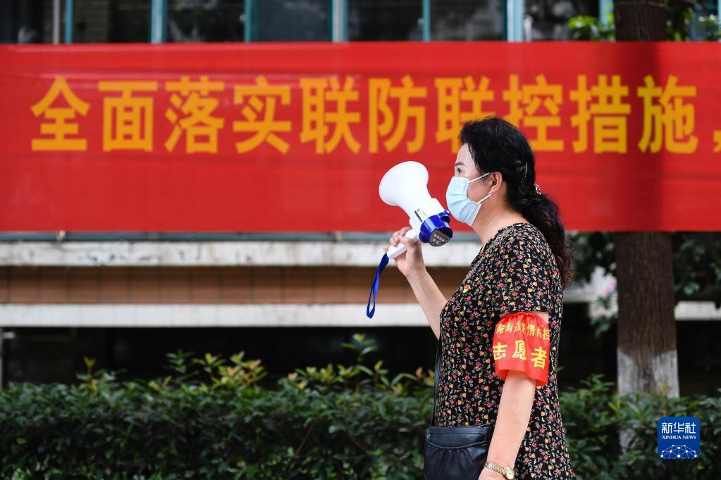 8月10日,在南京市建鄴區(qū)南苑街道吉慶家園小區(qū),志愿者馬維珍提示下樓活動的居民不要聚集扎堆。新華社記者 季春鵬 攝