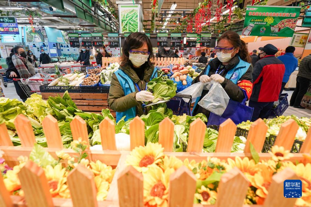 南京市建鄴區(qū)南苑街道興達(dá)社區(qū)的網(wǎng)格長范璐(左)和同事在超市為轄區(qū)內(nèi)居民代購蔬菜(2020年2月17日攝)。新華社記者 李博 攝
