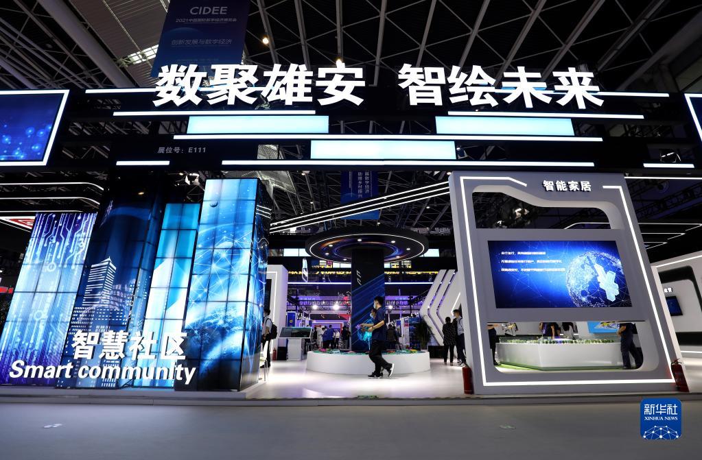 9月6日,參觀者在2021中國國際數(shù)字經(jīng)濟(jì)博覽會上參觀“數(shù)聚雄安 智繪未來”雄安展區(qū)。新華社發(fā)(梁子棟 攝)
