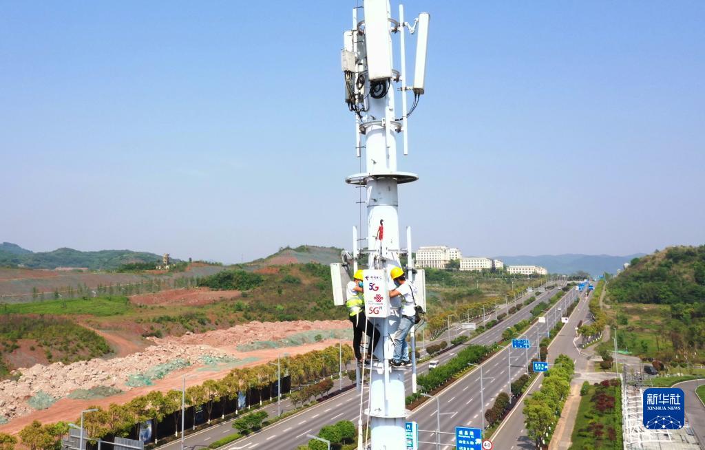 工作人員在位于重慶高新區(qū)高新大道的5G基站建設(shè)現(xiàn)場作業(yè)(2020年4月15日攝,無人機(jī)照片)。新華社記者 王全超 攝