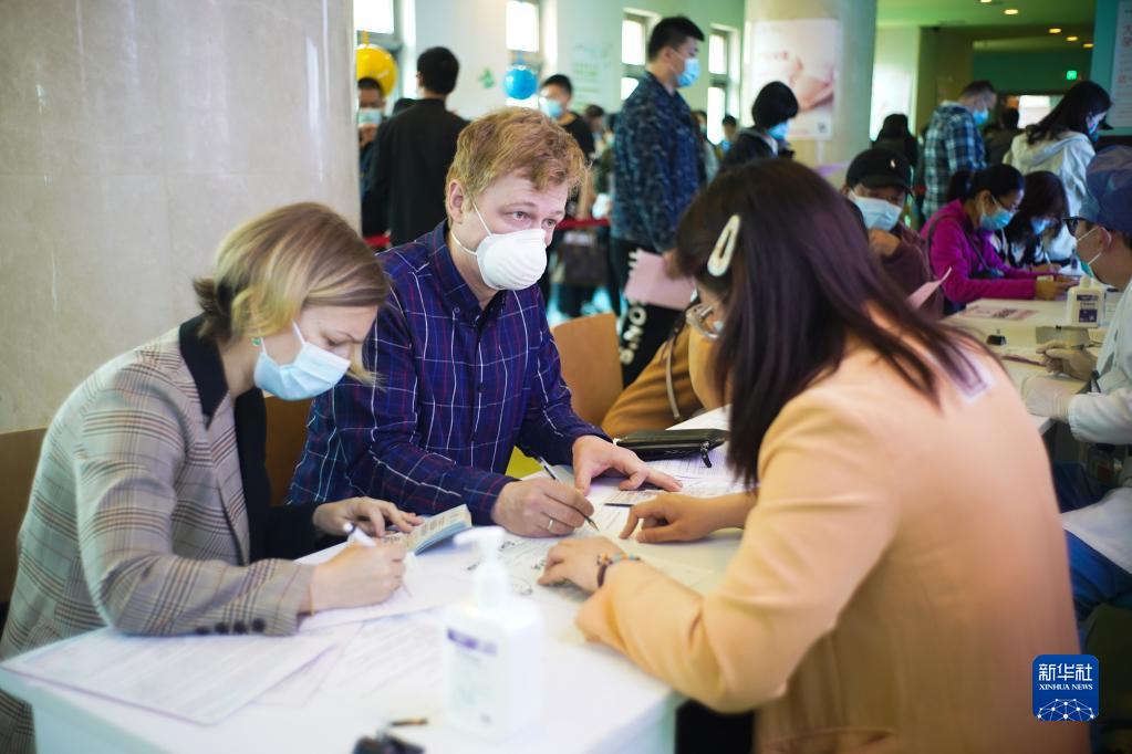 4月15日,在位于北京經(jīng)濟(jì)開發(fā)區(qū)的一處新冠疫苗接種點(diǎn),外籍人士接種新冠疫苗前填寫個人信息。新華社記者 彭子洋 攝