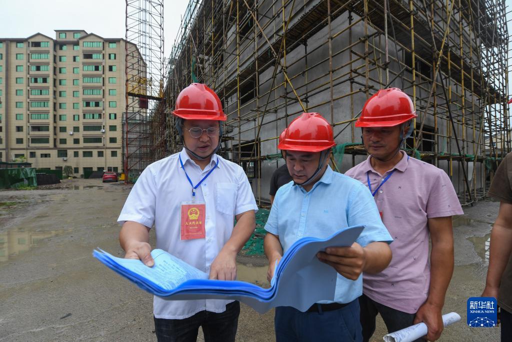 2021年6月2日,在浙江省湖州市吳興區(qū)東林鎮(zhèn)星火村,當(dāng)?shù)厝舜蟠淼揉l(xiāng)村議事會成員對星火村農(nóng)民新村建設(shè)項目的施工進展情況進行監(jiān)督檢查。新華社記者 徐昱 攝