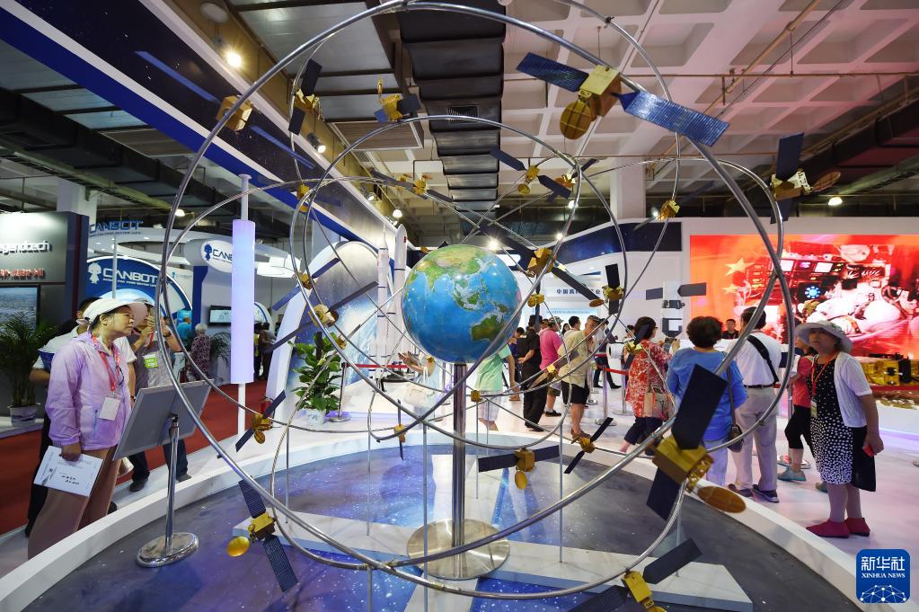 參觀者在第二十屆中國北京國際科技產(chǎn)業(yè)博覽會(huì)上參觀展出的北斗衛(wèi)星導(dǎo)航系統(tǒng)模型(2017年6月9日攝)。新華社記者 鞠煥宗 攝