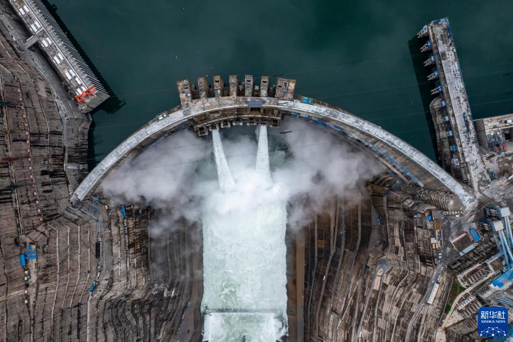 俯瞰白鶴灘水電站(無人機(jī)照片,6月28日攝)。金沙江白鶴灘水電站首批機(jī)組于6月28日安全準(zhǔn)點(diǎn)投產(chǎn)發(fā)電。新華社記者 江文耀 攝