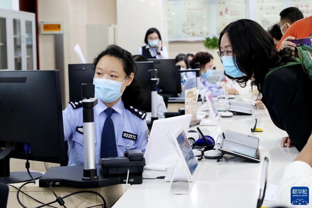 2020年10月14日,原籍浙江湖州的王秀麗(右)在上海市徐匯漕河涇社區(qū)事務(wù)受理服務(wù)中心公安綜合窗口辦理戶口遷移手續(xù),成為享受上海市公安局會(huì)同浙江省公安廳共同推出的滬浙“跨省市戶口網(wǎng)上遷移”便民措施的第一人。新華社記者 方喆 攝