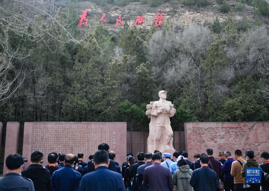 黨員干部在陜西省延安市張思德廣場(chǎng)進(jìn)行現(xiàn)場(chǎng)教學(xué)活動(dòng)(3月29日攝)。新華社記者 張博文 攝