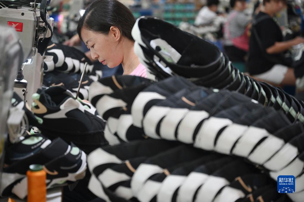 在位于福建省泉州市的鴻星爾克集團(tuán)鴻榮輕工公司車(chē)間,工人在制鞋生產(chǎn)線(xiàn)上作業(yè)(7月30日攝)。泉州市是我國(guó)重要的制造業(yè)基地,民營(yíng)企業(yè)較多。新華社記者 宋為偉 攝