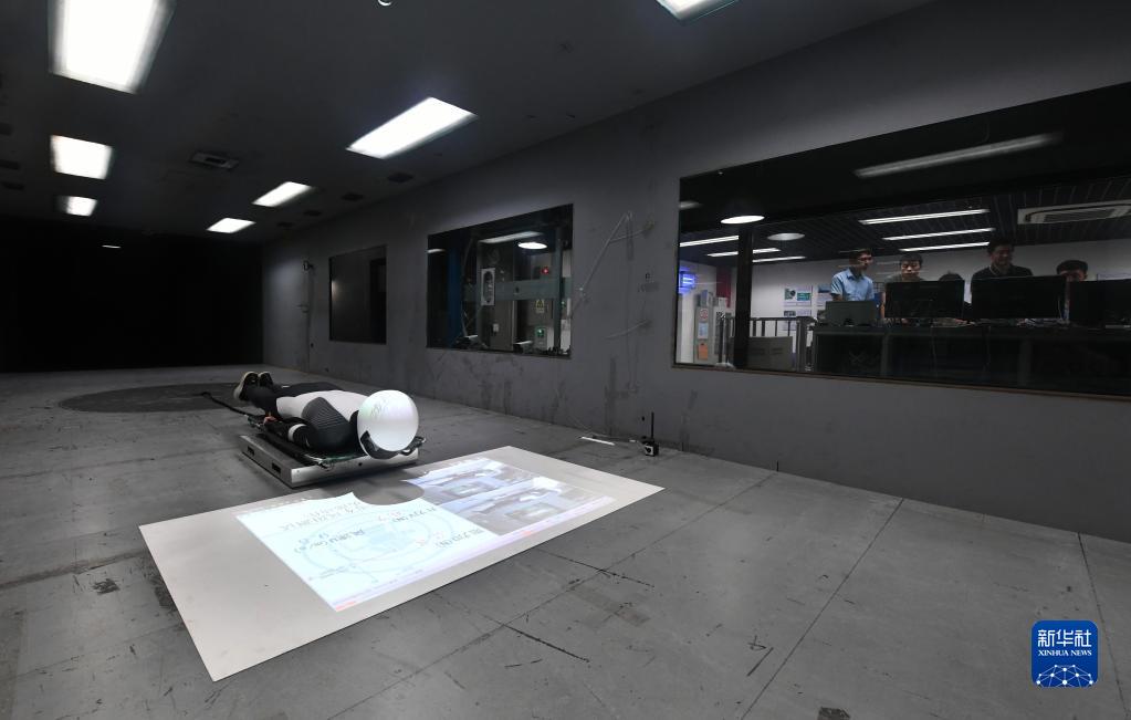 北京交通大學(xué)風(fēng)洞實驗室研究團隊成員通過風(fēng)洞輔助訓(xùn)練系統(tǒng)進行風(fēng)洞測試。該系統(tǒng)能夠應(yīng)用于冰雪項目運動姿態(tài)優(yōu)化、強化訓(xùn)練及高性能運動裝備研發(fā)(2021年7月16日攝)。新華社記者 任超 攝