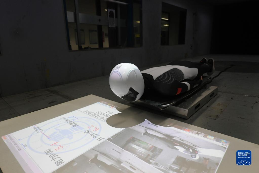 在北京交通大學(xué)風(fēng)洞實驗室,風(fēng)洞輔助訓(xùn)練系統(tǒng)顯示的信息將運動速度、運動風(fēng)阻力、運動姿態(tài)及測試指令實時反饋給測試人員(2021年7月16日攝)。新華社記者 任超 攝