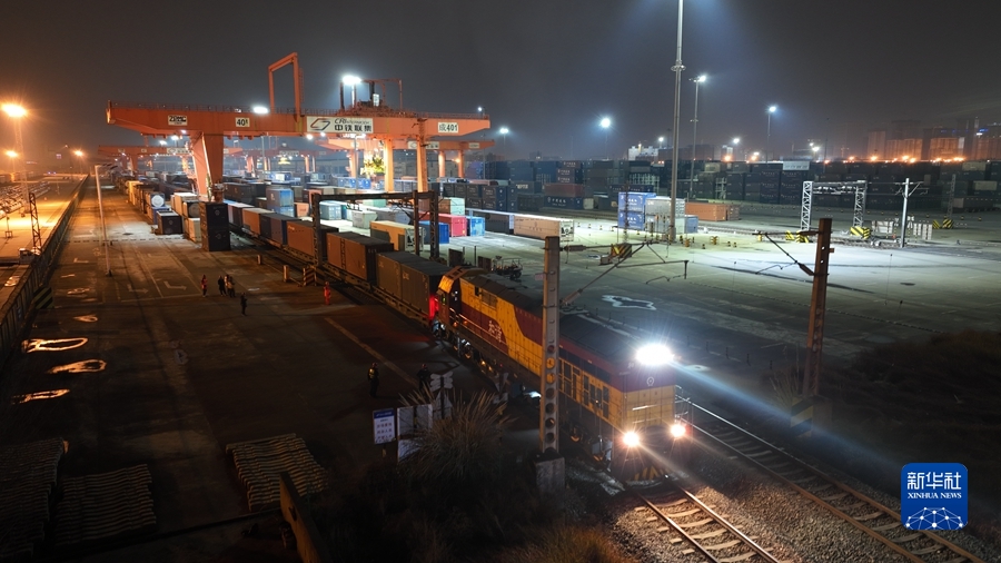 2022年1月28日,中歐班列X8086/5次列車駛出成都鐵路集裝箱中心站,這是中歐班列累計(jì)開行的第5萬列列車(無人機(jī)照片)。新華社發(fā)(白桂斌 攝)