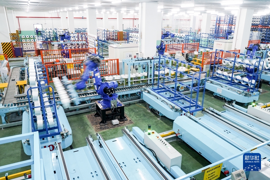 2021年5月14日,在位于江蘇省蘇州市吳江區(qū)盛澤鎮(zhèn)的一家智能車間,機(jī)器人在車間內(nèi)自動作業(yè)。新華社記者 李博 攝