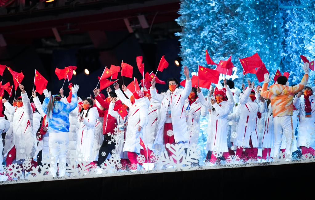 2月20日晚,中國代表團(tuán)成員在北京第二十四屆冬季奧林匹克運(yùn)動(dòng)會(huì)閉幕式中入場。新華社記者鞠煥宗攝